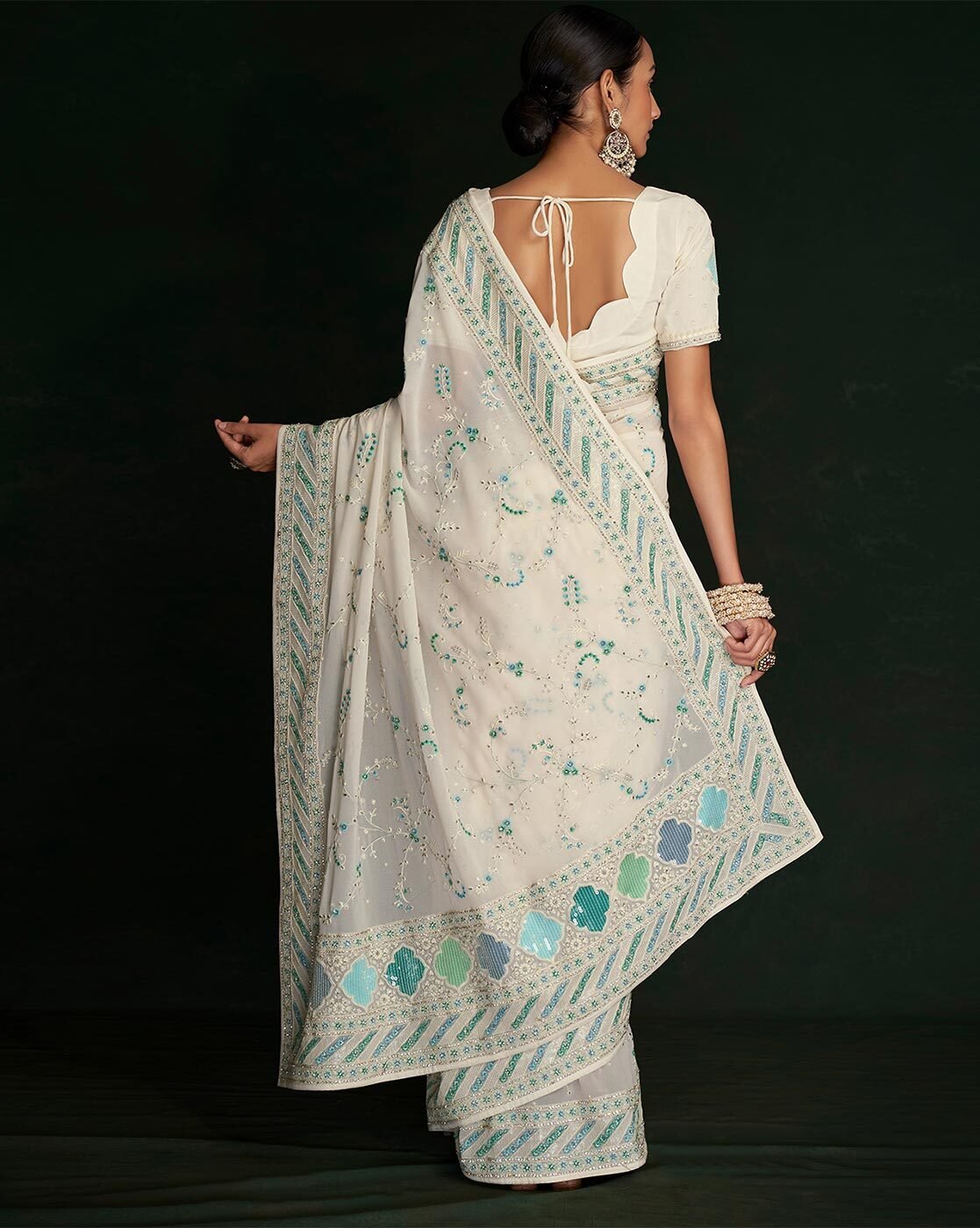 • The last image gives a detailed look of the blouse piece that comes with this saree (The model is wearing a blouse from our in-house wardrobe)