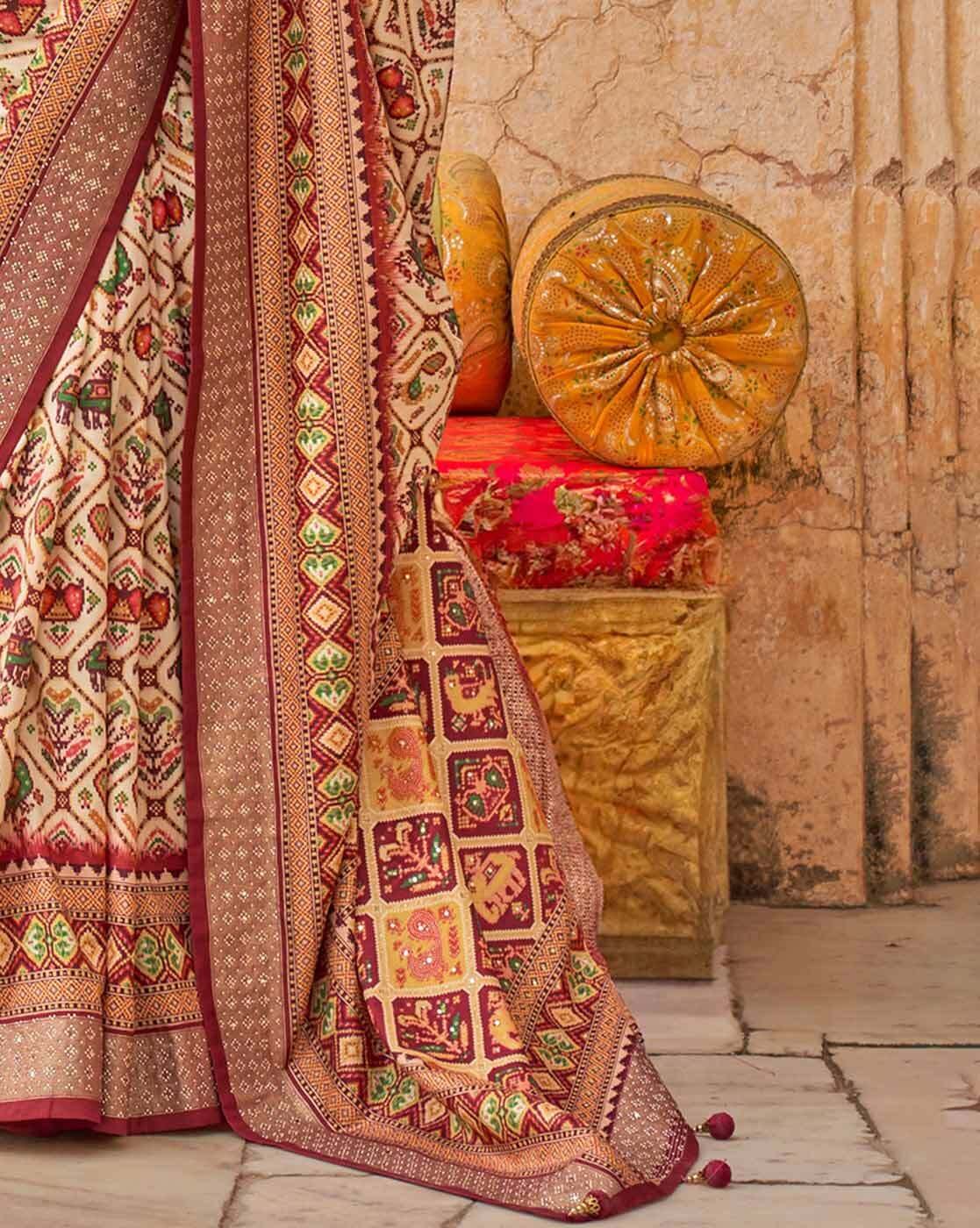 • Print & Pattern :- Ikat, Work Deatils :- Tassels and Latkans, Occasion :- Traditional/Festive, Type :- Patola